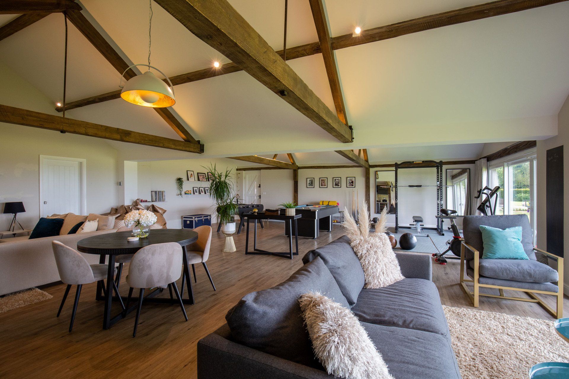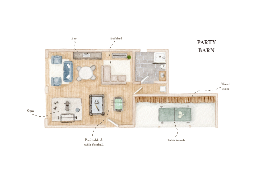 Everything you need for a fun night with friends and family. The Party Barn is across the driveway from Farmhouse Barn, its rustic Cotswold Style from the outside with a modern, hugely exciting games room inside. It is multi-purpose - play, party, relax, exercise and sleep - you can do it all in the Party Barn.
