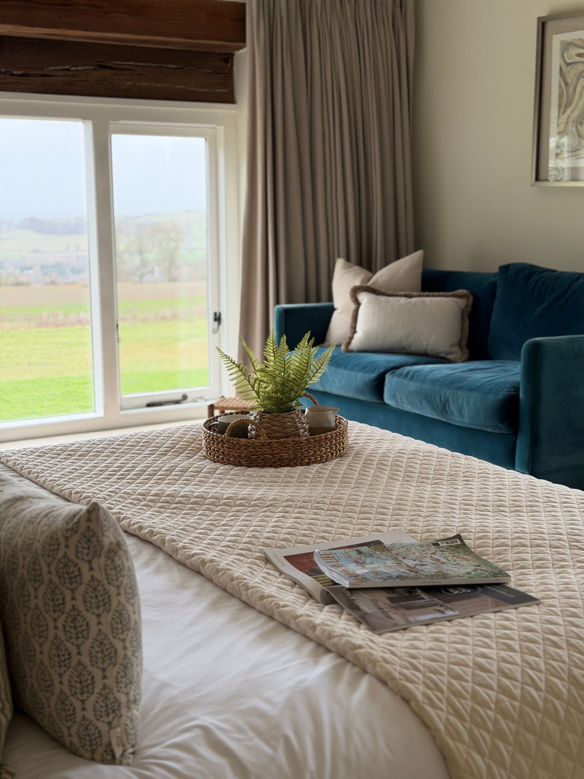 The huge farmhouse kitchen is the hub of the barn with plenty of space for cooking and entertaining. A sofa snug overlooks the view and it’s easy to spend all day chatting with friends and family and watching the ever-changing skies. The kitchen is fully fitted with everything you need for cooking and entertaining – we have thought of everything you need to celebrate, from plenty of champagne glasses to the Bluetooth Bose Speaker. The dining table seats 12 (14 at a squeeze) and extra tables can be arranged if needed.