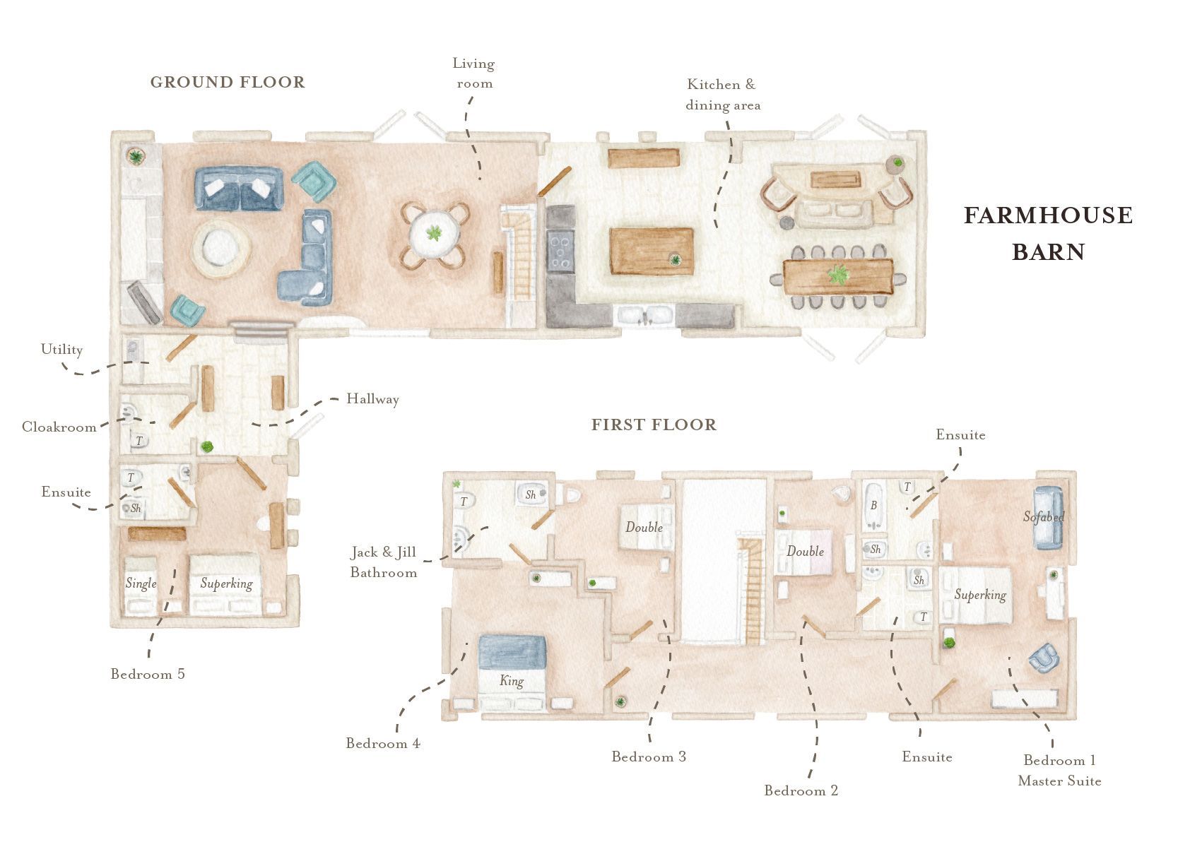 There are five double bedrooms, including the huge master suite with dressing table and seating area (can be converted into a sofabed). 3 bedrooms have their own ensuite and 2 bedrooms share a jack and jill ensuite. All are beautifully decorated with fresh linens and towels. All bathrooms are stocked with local Cotswold luxury aromatherapy toiletries.